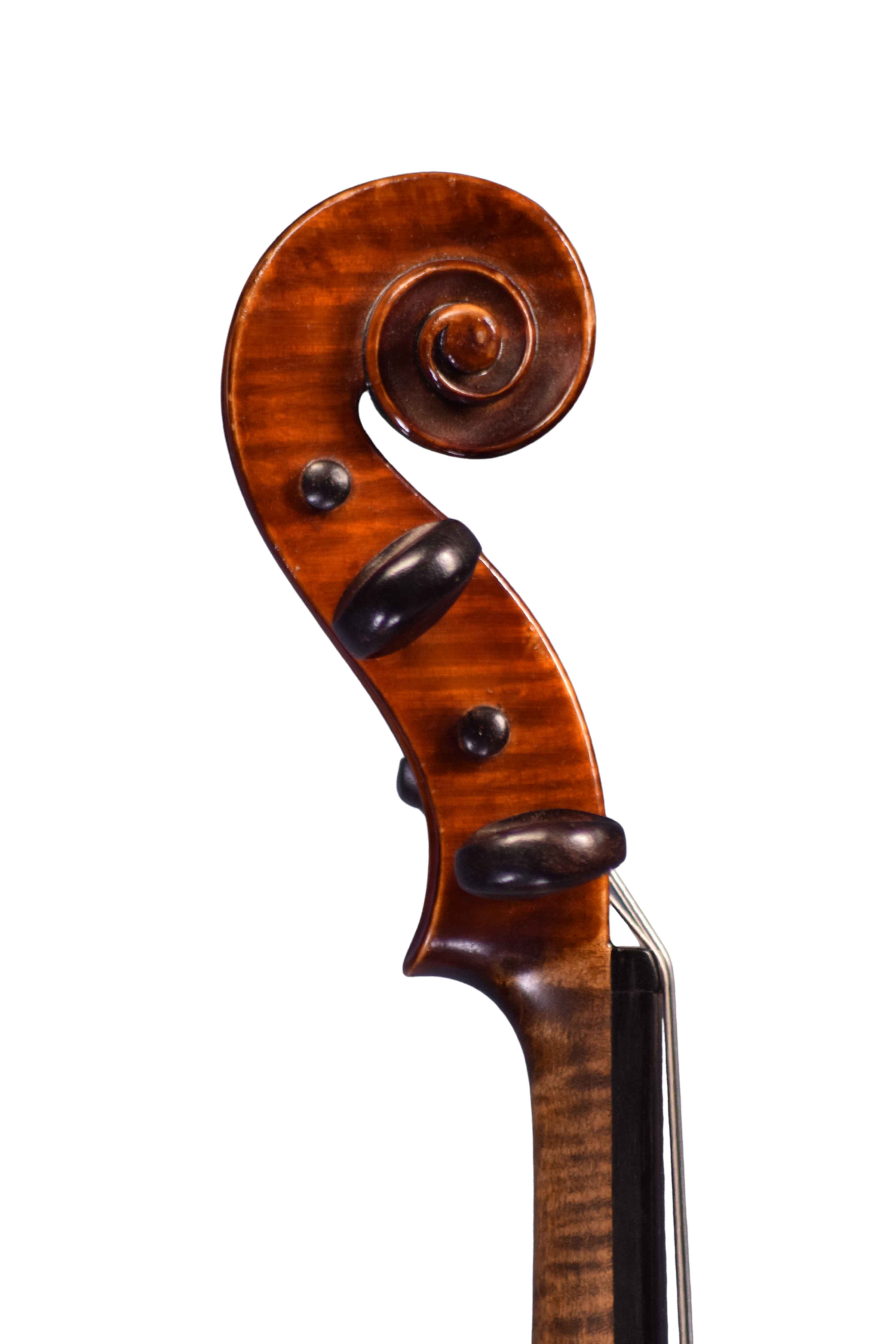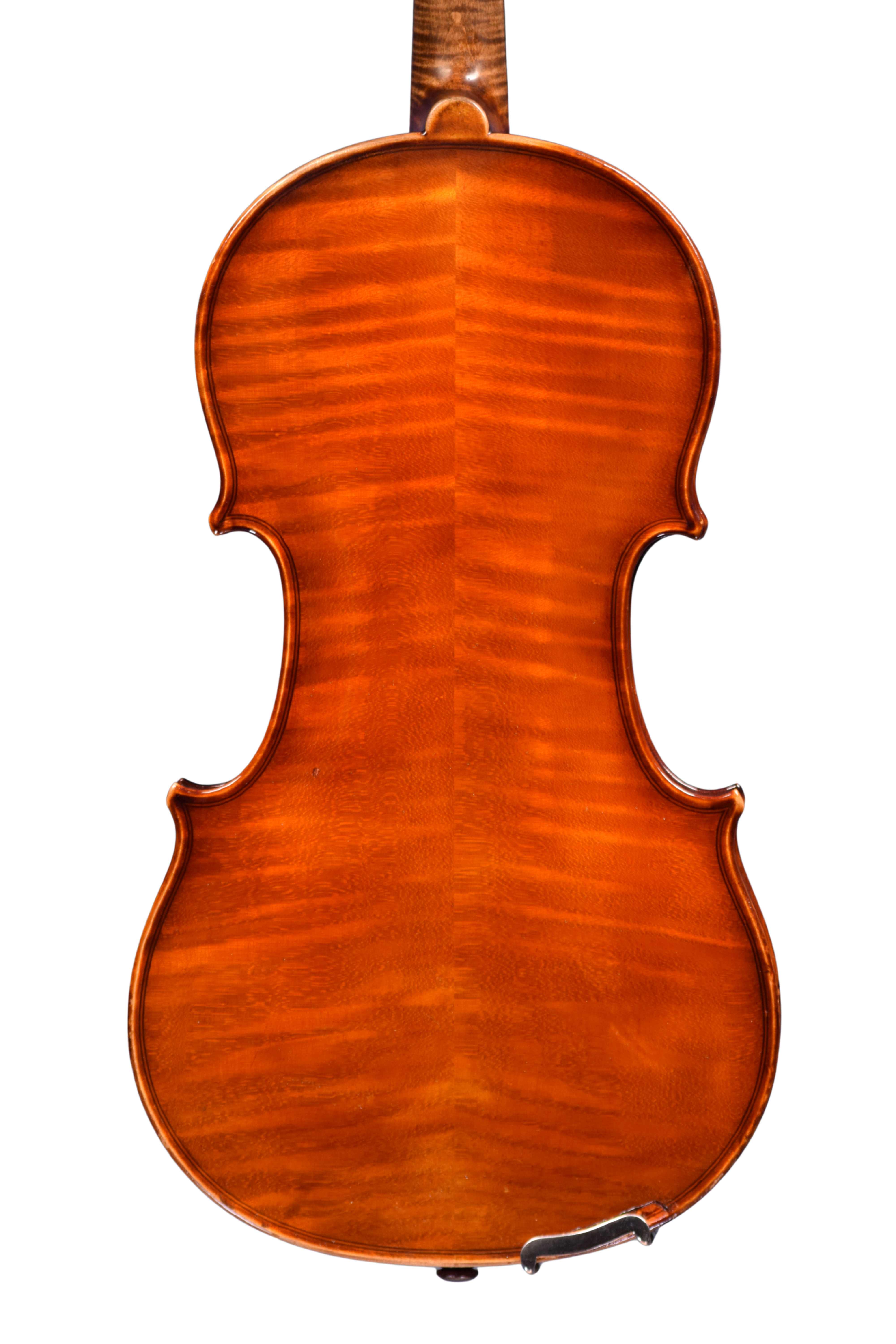 The violin has a two piece back of quarter-sawn maple with ribs and scroll to match. The front is two pieces of medium-grained spruce and the varnish is a soft golden-amber in colour.