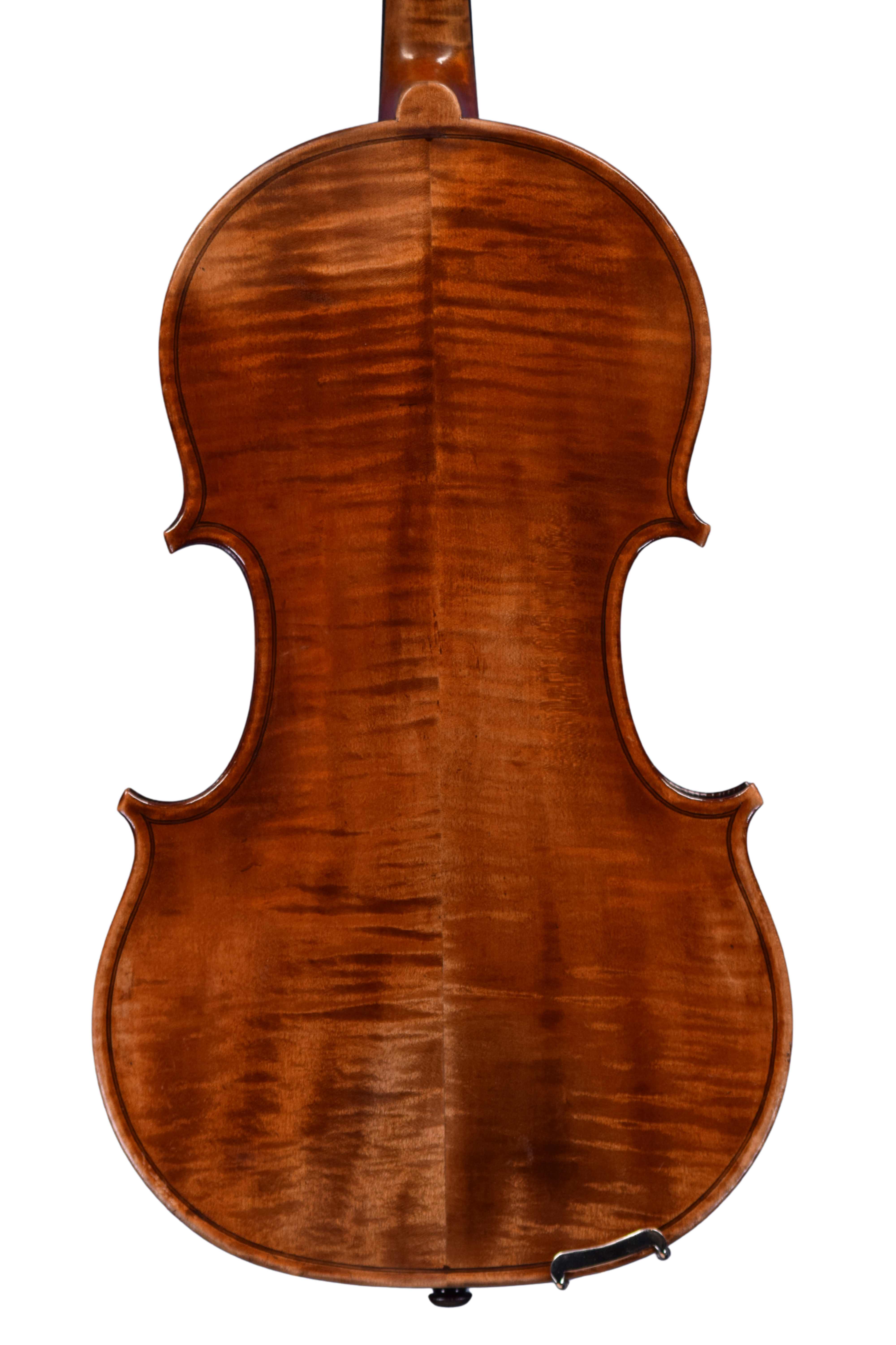 The two piece back is of highly-figured, book-matched maple. The front is two pieces of straight-grained spruce which widens considerably towards the flanks. The varnish is a very attractive golden-brown colour, laid over a lighter ground.
