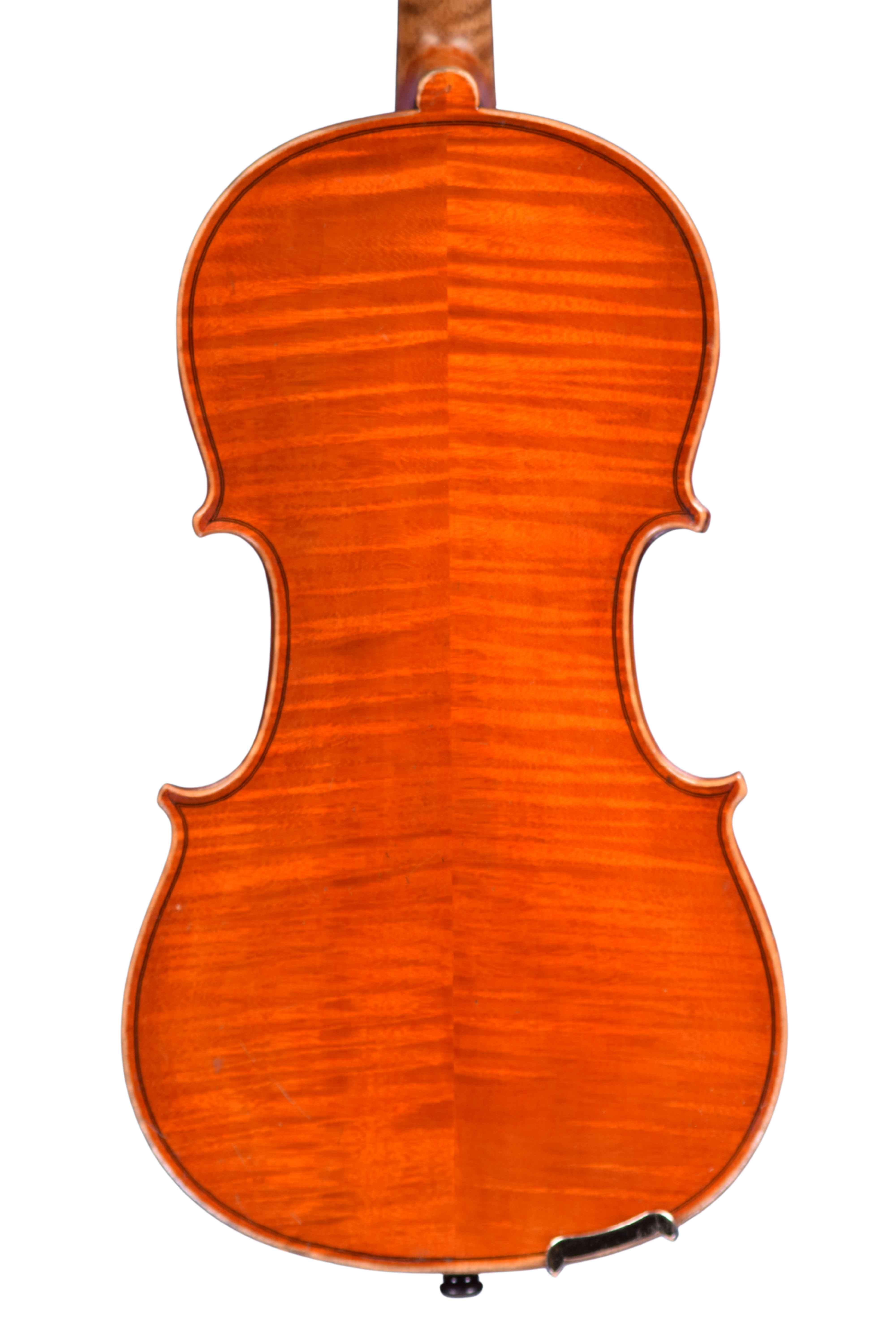 The violin has a two piece back of quarter-sawn maple, the figuration descending from the centre joint. The ribs are of similar wood, and the scroll is of plainer maple. The front is two pieces of straight-grained spruce and the varnish is a rich, unshaded reddish-amber.