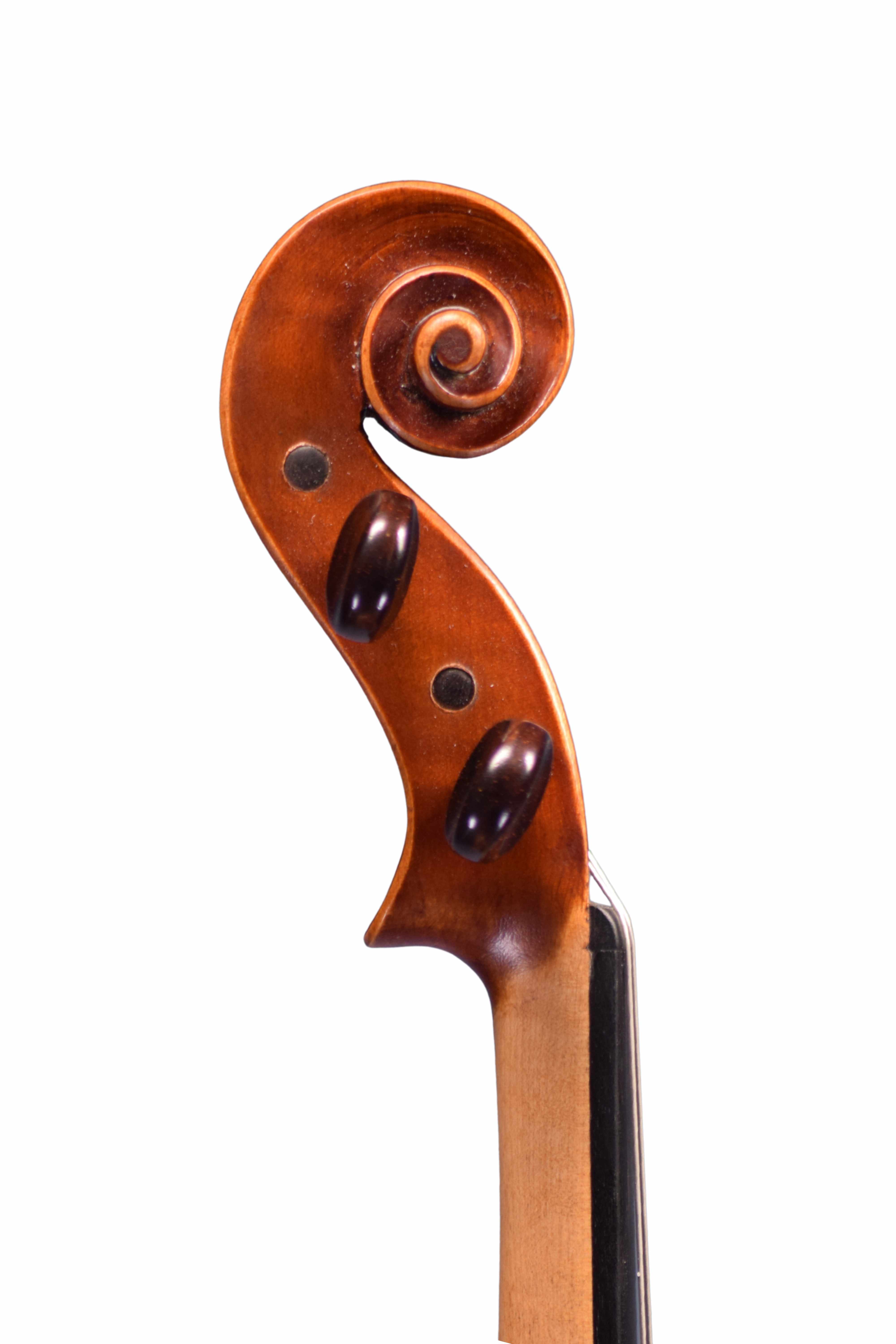 The violin has a two-piece back of quarter-sawn maple which ascends from the centre join. The ribs are of similar wood and the scroll is of plainer maple. The front is two pieces of straight-grained spruce and the varnish is an unshaded plum-red in colour.