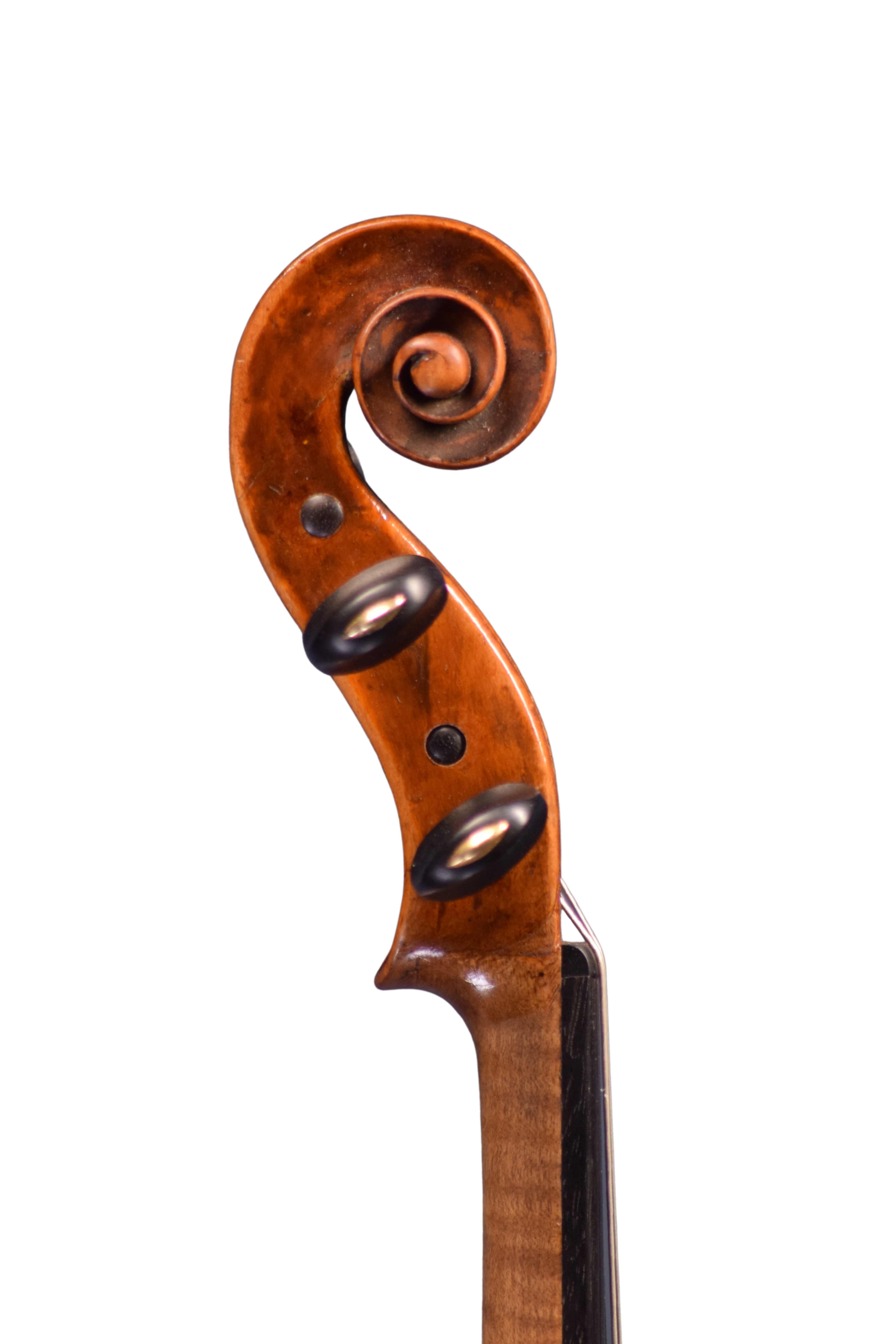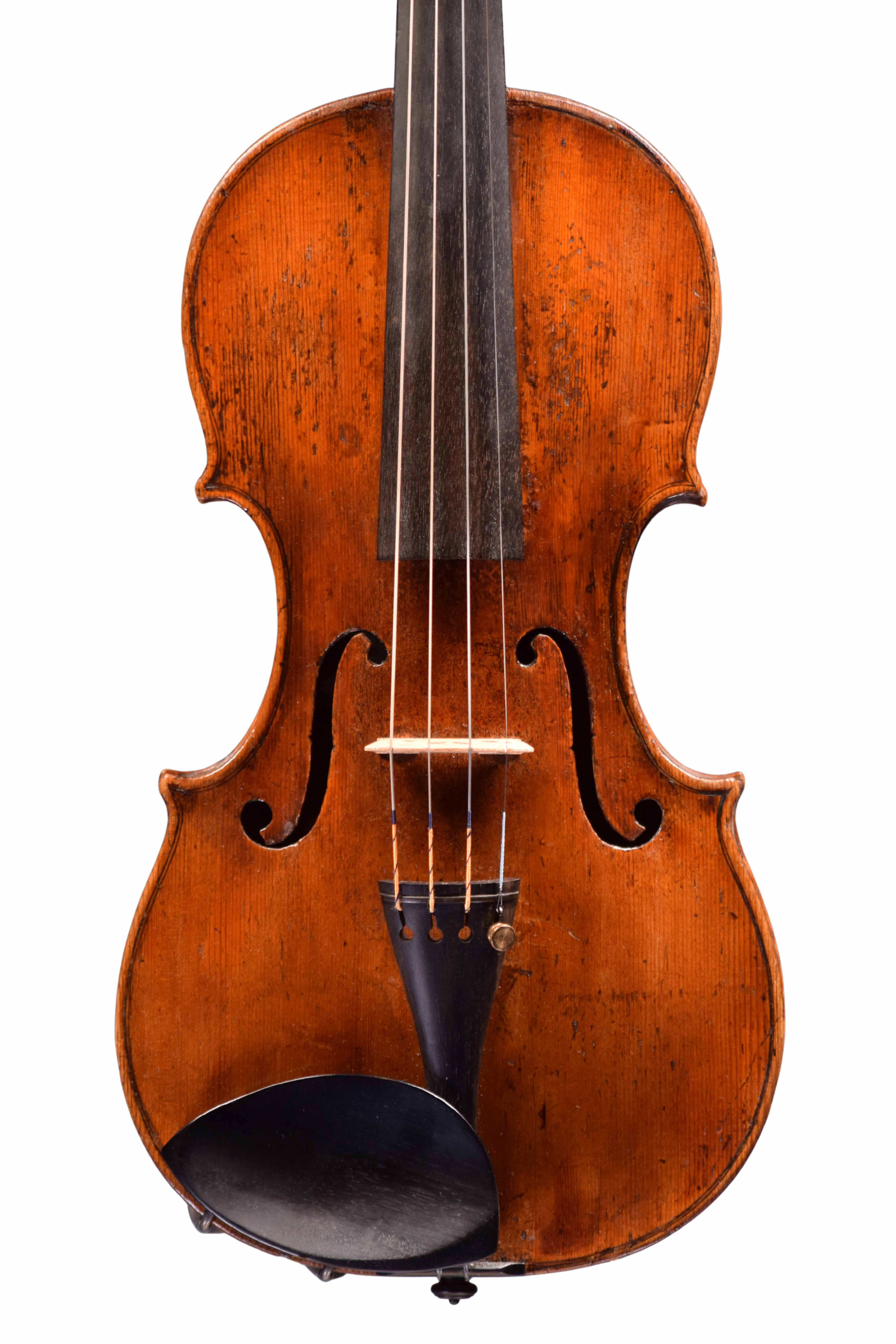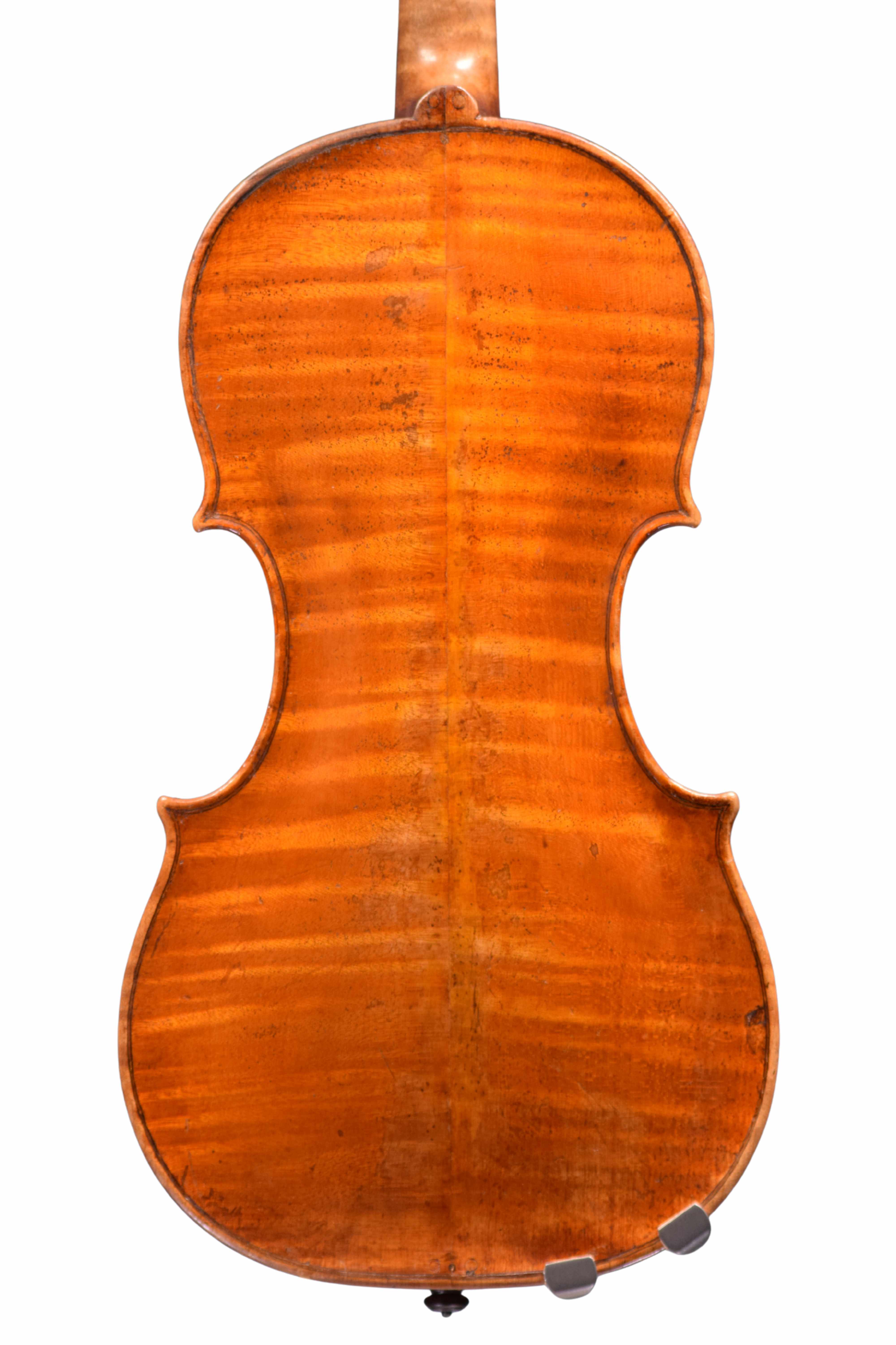 The violin has a two piece back of highly-figured maple. The ribs and scroll are of plainer wood. The front is two pieces of straight-grained spruce which widens towards the flanks and the varnish is golden-brown in colour.