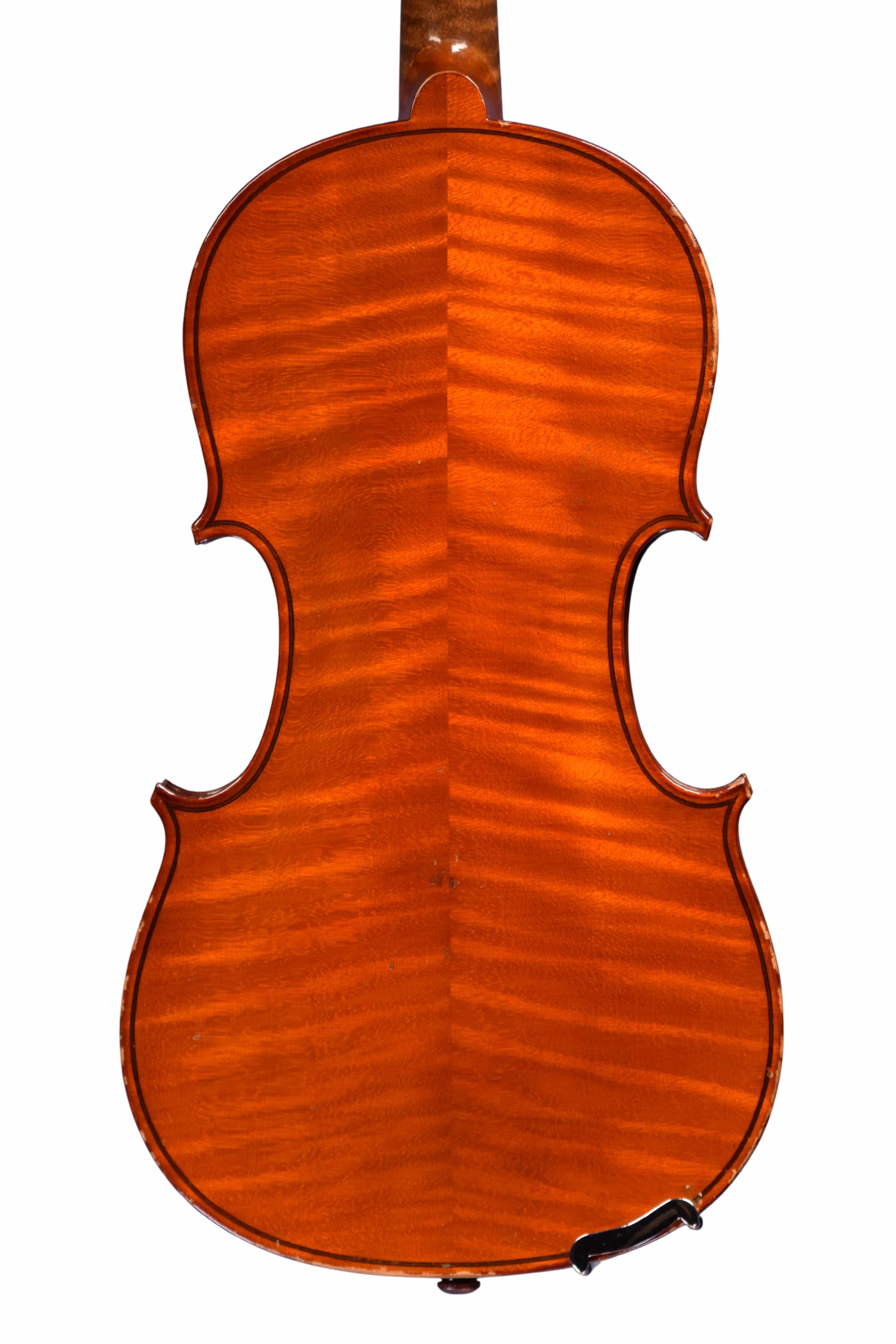 The violin has a two-piece back of highly-figured maple with ribs and scroll to match. The front is two pieces of narrow-grained spruce and the varnish is Craig's characteristic reddish-brown.