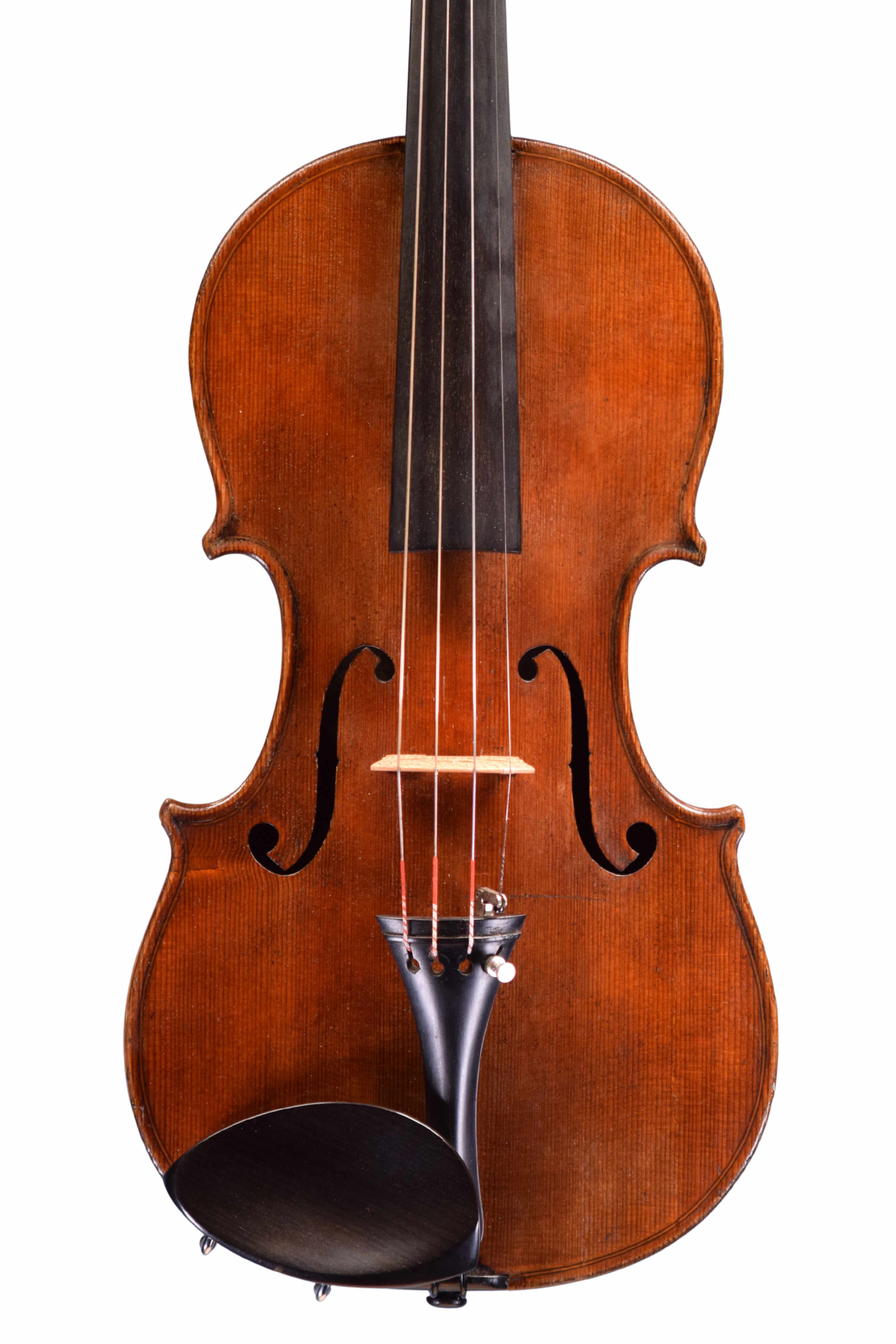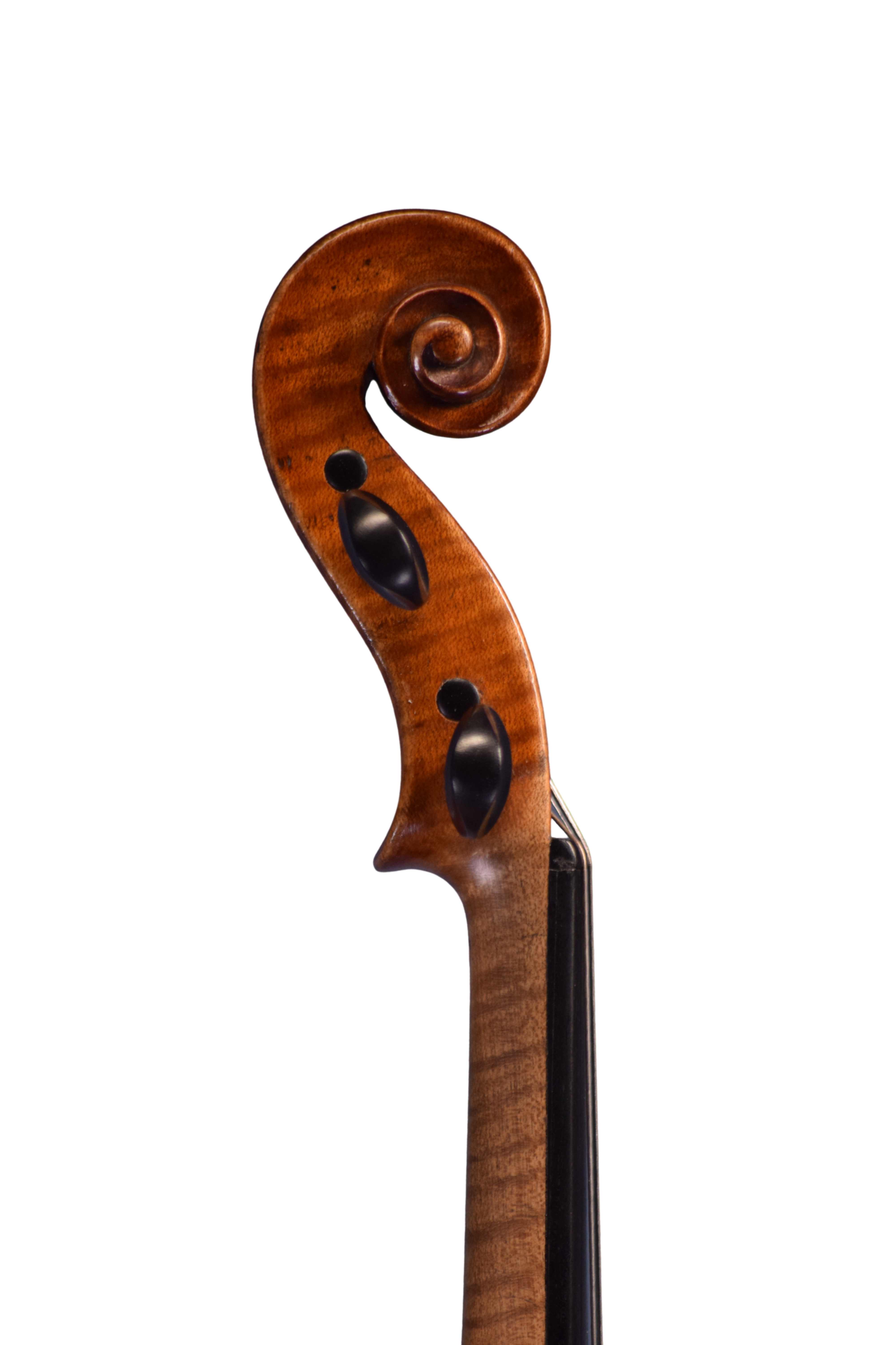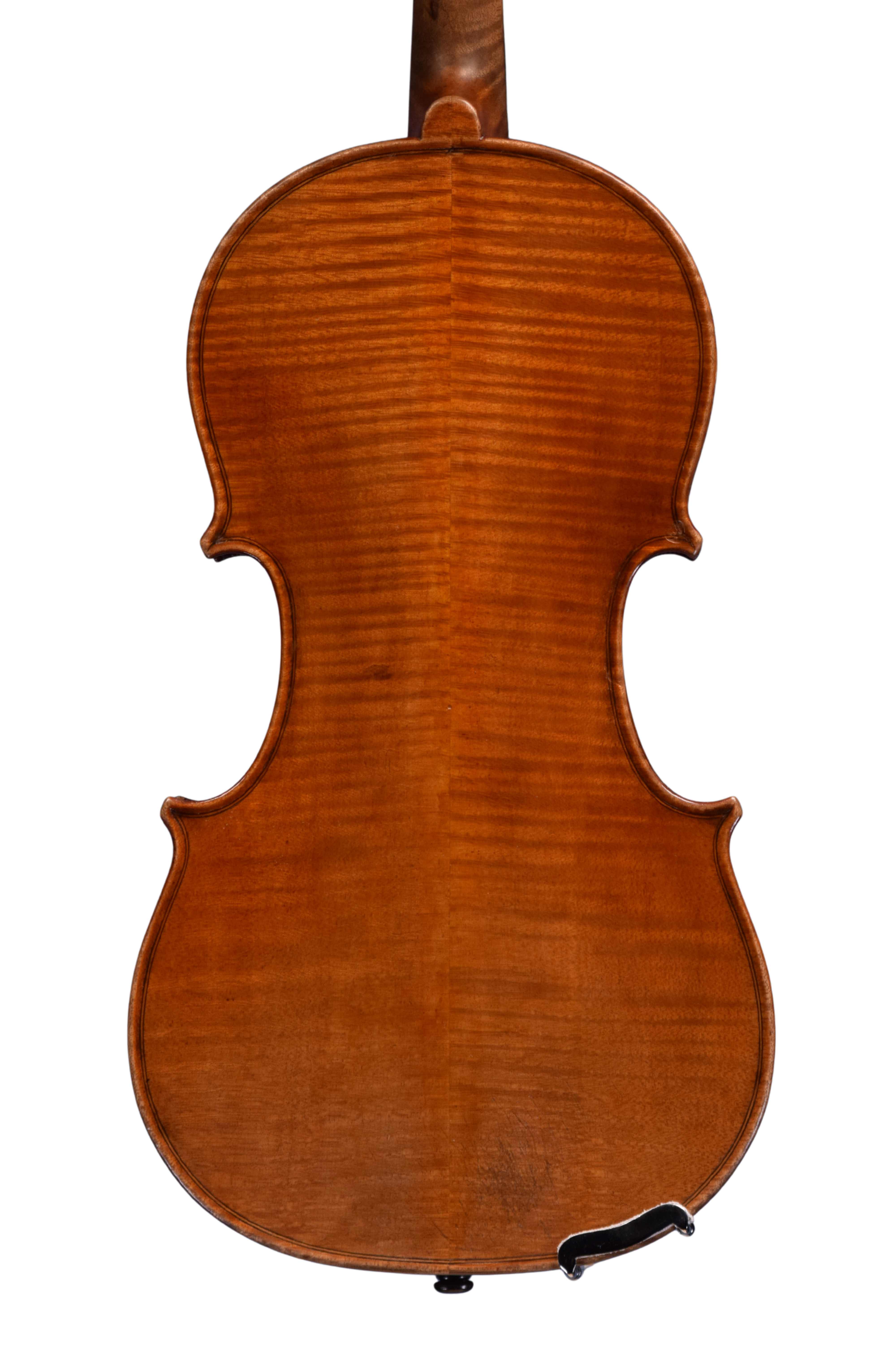 The violin has a two-piece back of quarter-sawn maple with ribs and scroll to match. The front is two pieces of fairly narrow-grained spruce and the varnish is amber-brown in colour.